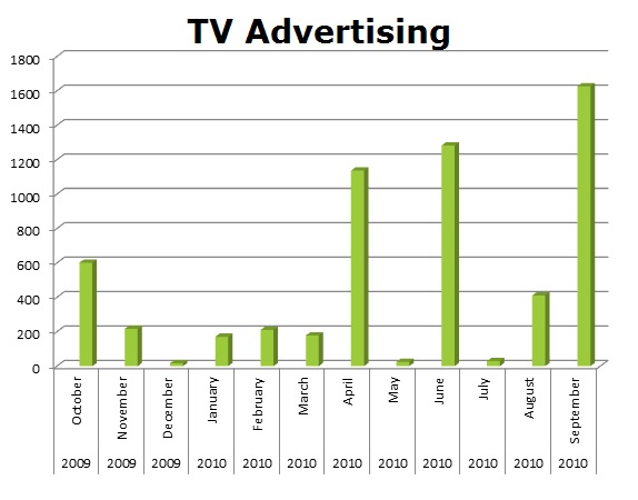 On TV, Panera Bread only ran 5,909 spots in the last 12 months. Last month was their biggest schedule with 1,627 ads placed on TV.