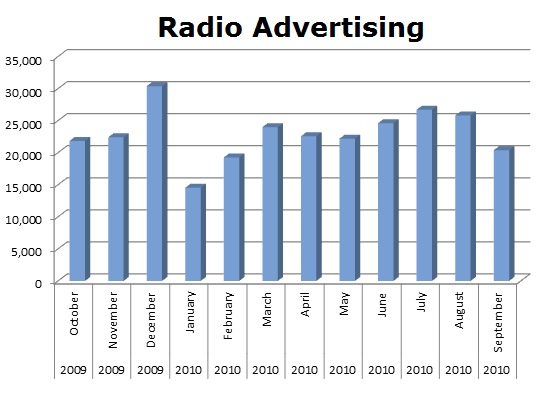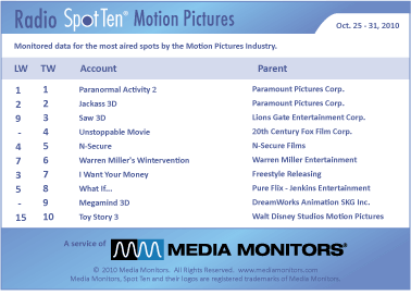 The #1 Motion Picture advertised on the radio last week was PARANORMAL ACTIVITY 2 with 4,877 spots nationwide. JACKASS 3D was #2 with 2,051 ads, while SAW 3D was #3 with 1,685 spots. Then we drop to #4 with the UNSTOPPABLE MOVIE with 414 spots and N-SECURE secured #5 by running 256 ads. WARREN MILLER’S WINTERVENTION was #6 with 236 spots, while I WANT YOUR MONEY grabbed #7 airing 173 spots. WHAT IF… was #8 with only 93 spots and MEGAMIND 3D was spending more time on TV promoting while they ran only 34 spots on radio to come in #9. TOY STORY 3 was #10 with 20 spots.