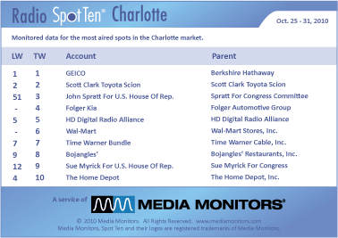 The #1 radio spot in Charlotte last week was GEICO with 823 units. Coming in #2 was SCOTT CLARK TOYOTA SCION running 634 spots, while JOHN SPRATT FOR US H.R. was #3 with 563 spots. FOLGER KIA was #4 airing 562 announcements and the HD DIGITAL RADIO ALLIANCE was #5 with 401 spots. WAL-MART came in #6 with 359 spots, while TIME WARNER BUNDLE scheduled 337 spots to land in #7. BOJANGLES’ ran 298 spots to come in #8 and SUE MYRICK FOR US H.R. was #9 with 289 spots. THE HOME DEPOT came in #10 with 287 ads.