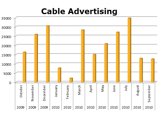 In Cable, the biggest months were July (34,736), December (30,577) and March (28,324). In the last 12 months, BNW ran 234,285 spots on Local Cable.