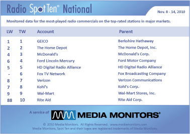 #1 once again was GEICO with 45,302 spots. THE HOME DEPOT was #2 running 39,356 spots, while MCDONALD’S was #3 with 27,193 commercials. FORD LINCOLN MERCURY was #4 with 20,719 spots and coming in #5 was the HD DIGITAL RADIO ALLIANCE with 20,413.