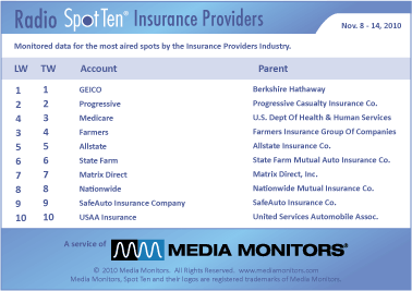 GEICO was #1 in the nation with 45,302 spots. PROGRESSIVE was #2 running 12,623 spots on the radio, while MEDICARE (US Dept. of Health & Human Services) ran 8,574 spots to come in #3. FARMERS clocked in at #4 with 6,391 spots and ALL STATE was #5 airing 5,576 spots. MATRIX DIRECT was #7 with 3,030 commercials, while NATIONWIDE was on your side at #8 with 2,715 spots. SAFEAUTO INSURANCE was #9 running 2,202 spots and USAA INSURANCE was #10 with 2,079 spots.