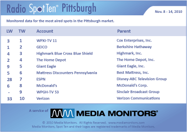 In the Steel City last week, the #1 radio advertiser was WPXI-TV 11 with 969 spots. GEICO was #2 airing 723 spots, while HIGHMARK BLUE CROSS BLUE SHIELD was #3 with 513 spots. THE HOME DEPOT came in #4 running 462 commercials and GIANT EAGLE ran 452 spots to come in #5. MATTRESS DISCOUNTERS PENNSYLVANIA was #6 with 414 spots, while ESPN jumped from #28 to #7 airing 372 announcements. MCDONALD’S was #8 with 371 spots and WPGH-TV 53 was #9 with 316 spots. VERIZON was #10 with 312 spots.