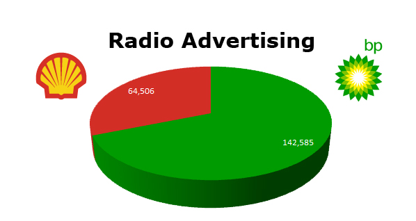 On the Radio, Shell ran 64,506 ads in the last 12 months, whereas BP ran 142,585 spots in the same period. Shell ran only 42.5% as many spots as BP that ran the greatest number of spots during their crisis: 24,359 spots in July, 25,487 spots in August and 23,572 in September, then dropping off to 19,050 spots in October.