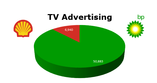 On TV, BP ran 50,883 spots against Shell’s 6,940 spots. The summer certainly was the time that BP was trying to get its message out: June (8,156), July (8,877), August (12,116) and September (8,632). Last month, they dropped to 1,677 spots.