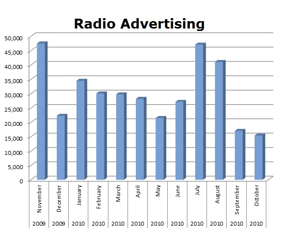 Obviously when you are world’s most successful cable sports channel, you would certainly use cable to get your message out. ESPN ran 978,352 spots on Cable in the last 12 months. There biggest month was October with 111,515 spots. October has not only the World Series, but the NFL was in full gear then, as well.