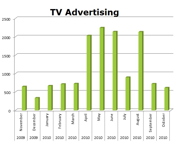 In the last 12 months Shell has run 126,908 spots. BP ran 66,953 spots during the same time, which included the advertising that they did after the oil spill in the Gulf of Mexico. BP ran most of these commercials in July (10,959), August (20,849) and September (12,169), dropping back to levels of 1,000 ads after they capped the well. To put this in perspective, Shell’s biggest months were in January (23,017), Februrary (20,810) and March (23,517).