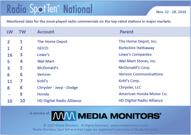 We have a new #1 this week, THE HOME DEPOT rising from #2 with 45,147 spots. Dropping to #2 was GEICO with 30,441 spots. LOWE’S surges from #16 up to #3 with 30,142 ads, while WAL-MART was #4 airing 26,723 spots. MCDONALD’S was #5 with 24,964 spots.