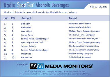 In the nation, the #1 alcoholic beverage advertised on the radio last week was BUD LIGHT running 4,862 spots. Coming in #2 was its brother BUDWEISER with 3,525 spots, while COORS LIGHT hit #3 with 2,693 spots. CROWN ROYAL was #4 airing 1,743 commercials and SAM ADAMS WINTER LAGER was #5 with 1,313 spots. COORS LIGHT HOME DRAFT was #6 with 1,026 spots and SAMUEL ADAMS was #7 with 954 spots. Popping in at #8 was SAM ADAMS BOSTON LAGER with 932 spots and MILLER LIGHT was #9 running 905 spots. Coming in at #10 was BUCHANAN’S with 885 spots.