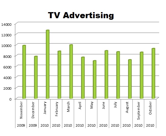 On TV, they ran 106,633 spots in the last 12 months. The biggest was last January when they ran 12,709 spots.