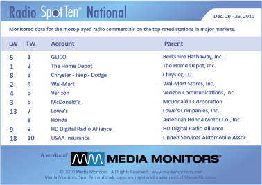 Moving to the top of the National Radio spot list last week was GEICO, up from #5 previously, with 30,731 spots. Coming in #2 was THE HOME DEPOT with 29,708 ads, while CHRYSLER – JEEP - DODGE was #3 with 29,519 spots. WAL-MART was #4 with 26,672 spots and VERIZON took the #5 spot with 26,495 commercials.
