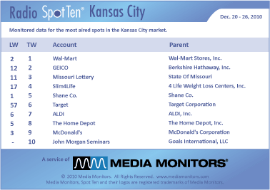Last week, the #1 radio advertiser in Kansas City was WAL-MART with 500 commercials. Coming in #2 was GEICO with 469 spots, while the MISSOURI LOTTERY was #3 with 467 ads. SLIM4LIFE was #4 with 424 spots and SHANE CO. came in #5 airing 416 announcements. TARGET was #6, up from #57 last week, with 410 spots, while ALDI was #7 with 394 commercials. THE HOME DEPOT was #8 running 375 spots and MCDONALD’S dropped to #9, from #3 last week, with 370 ads. Coming in #10 was JOHN MORGAN SEMINARS, a newcomer to the top 10, with 350 spots.