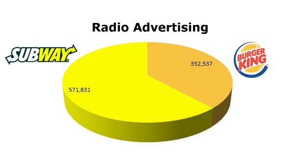 On the Radio, SUBWAY ran 571,831 spots to Burger King’s 352,537 commercials in the last 12 months. On the radio, the biggest month for Burger King was last December with 39,100 spot. SUBWAY’S biggest month was August with 64,511 spots.
