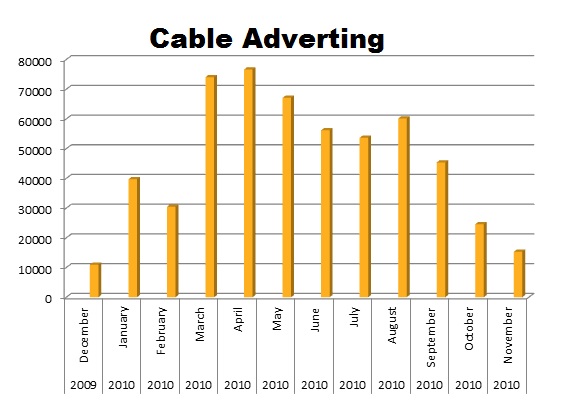 Kraft Foods ran 60% of their spots on Cable. In the last 12 months, they ran 554,099 spots on Cable with biggest month in April with 76,628 ads.