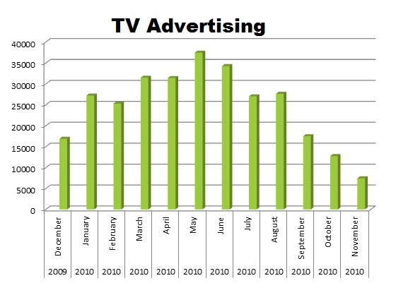 On TV, Kraft Foods also peaked in May with 37,450 but was more consistent than radio. The total for the last 12 months was 296,328 spots.