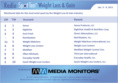 Taking weight off is an important subject for a lot of people this time of year. In the nation, SENSA was #1 with 6,164 spots. RIGHTSIZE was #2 running 5,837, while ACAI FRESH was #4 with 3,288 spots. NUTRISYSTEMS was #4 airing 2,345 announcements and WEIGHT WATCHERS was #5 with 859 spots. WEIGHT LOSS CENTERS slimmed from #4 to #6 with 856 spots, while MEDIFAST was #7 running 702 spots. JILLIAN MICHAELS was #8 with 645 spots and EVERYDAY HEALTH was #9 with 628 ads. Coming in #10 was QUICK WEIGHT LOSS CENTERS with 610 spots.