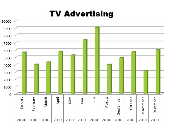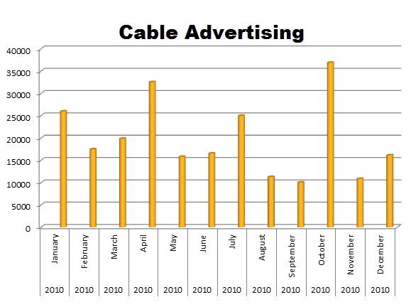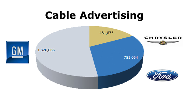 On Cable GM dominates the media with 1,320,066 spots against Chrysler’s 431,875 ads and Ford’s 781,054 ads. Chrysler’s biggest month was August (62,436), while Ford’s biggest month was October (80,604) and GM pushed hardest in December (141,478).