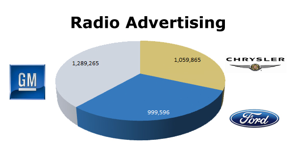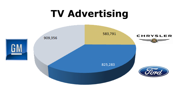 On TV, GM ran 909,356 spots in the last 12 months, against Chrysler with 583,791 ads and Ford’s 825,283 commercials. Chrysler’s biggest month was July (57,503), Ford’s top month was December (81,448) and GM pushed hardest in December as well with 105,100 spots.