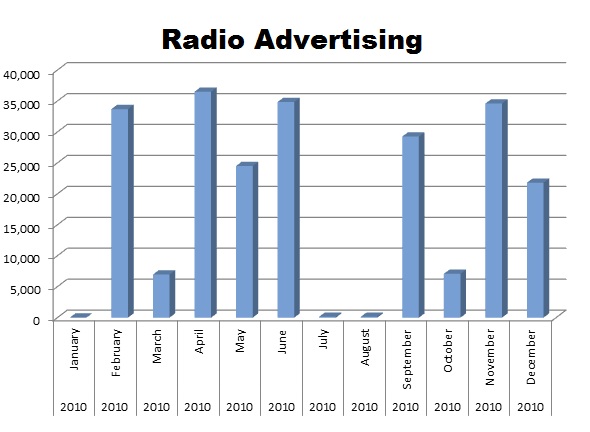 The Big Three all use radio wisely, with GM edging out the other two with 1,289,265 spots. Chrysler ran 1,059,865 spots and Ford was in with 999,596 in the last 12 months. Chrysler finished the year strong with October, November and December all over 100,000 ads with December totaling 157,824. Ford banged hard in July (103,807) and August (102,384), while GM had six months over 100,000 ads with July the biggest with 143,390 spots.