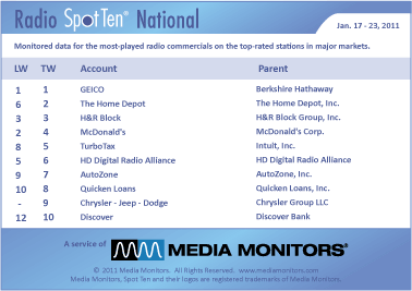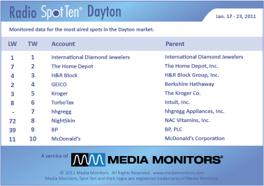 In Dayton last week the number one radio advertiser was INTERNATIONAL DIAMOND JEWELERS with 1,130 spots. THE HOME DEPOT was #2 with 683 spots, while H&R BLOCK was #3 airing 447 announcements. GEICO was #4 with 410 spots and KROGER was #5 with 402 commercials. TURBOTAX netted #6 with 324 spots, while HHGREGG was #7 running 309 ads. NIGHTSKIN jumped from #72 to #8 with 240 spots and BP rose from #39 to #9 with 230 spots. MCDONALD’S was #10 with 221 spots.