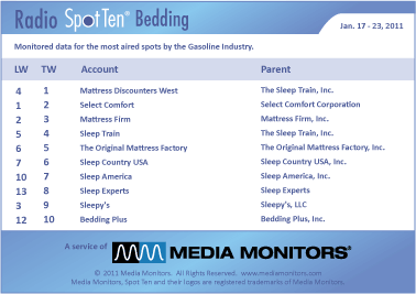 Last week in the national bedding scene, these were the top advertisers on radio. #1 was MATTRESS DISCOUNTERS WEST with 2,194 spots. SELECT COMFORT was #2 with 1,898 commercials, while MATTRESS FIRM was #3 with 1,976 ads. SLEEP TRAIN was #4 airing 1,691 announcements and THE ORGINAL MATTRESS FACTORY was #5 with 1,217 spots. SLEEP COUNTRY USA was #6 running 1,136 spots, while SLEEP AMERICA was #7 with 678 spots. SLEEP EXPERTS were #8 with 253 ads and SLEEPY’S was #9 with 201 spots. And resting at #10 was BEDDING PLUS with 176 spots.