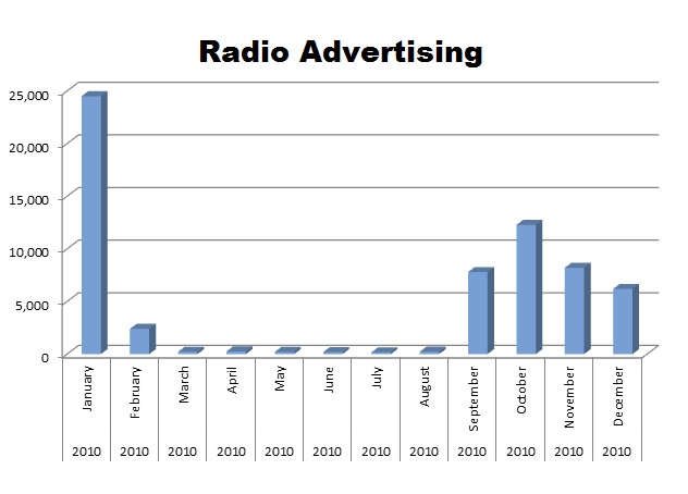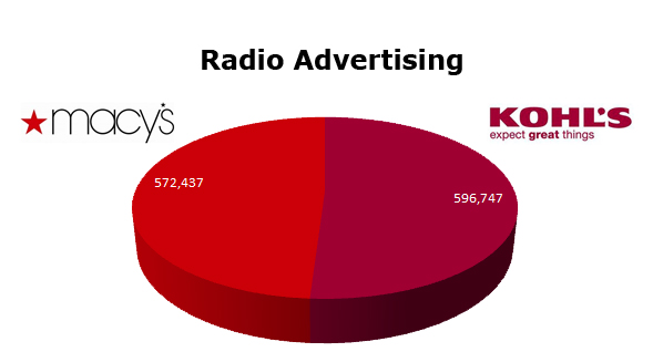 Radio was almost even with Macy’s running 572,437 spots to Kohl’s 596,747 spots. Biggest month for Kohl’s was November with 80,407 to Macy’s December 91,243 spots.