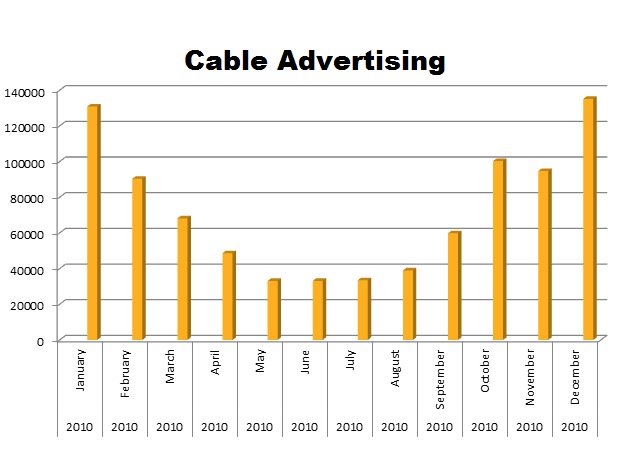 On Cable, Campbell’s Soup Company ran 866,324 spots in the last 12 months. And keeping with the idea that soups taste great when it is cold outside, their biggest months were January (130,806) and December (135,116) spots.