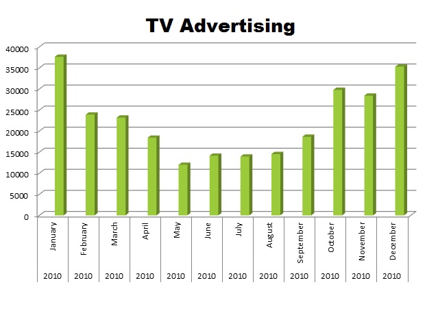 And on TV, a big January with 37,657 spots, then the middle dip, with a return in the fall. December was the next biggest month with 35,305 spots. Campbell’s ran a total of 270,116 spots on TV in the last 12 months.