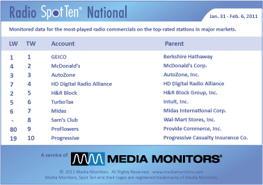 GEICO continues its lock on #1 with 47,746 spots. MCDONALD’S was up from #4 to #2 with 27,203 spots, while AUTOZONE was #3 with 23,918 ads. The HD DIGITAL RADIO ALLIANCE surged from #7 to #4 with 20,656 spots and H&R BLOCK dropped from #2 to #5 with 20,584 spots.