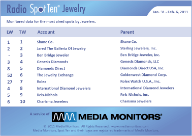 The SHANE COMPANY was #1 in the USA with 8,515 spots in this category. JARED THE GALLERIA OF JEWELRY was #2 with 8,175 spots, while BEN BRIDGE JEWELRY was #3 airing 2,982 commercials. GENESIS DIAMONDS was #4 with 2,350 spots and DIAMONDS DIRECT shined at #5 running 1,793 ads. THE JEWELRY EXCHANGE was #6 with 1,503 spots, while ROLEX jumped from #27 to #7 with 1,245 spots. INTERNATIONAL DIAMOND JEWELRYS hit #8 with 1,134 spots and REIS-NICHOLS locked in #9 with 661 spots. CHARISMA JEWELYRS was #10 with 649 spots nationally.