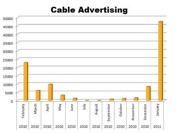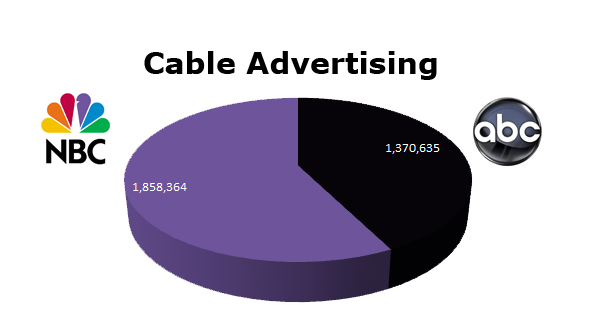 On Cable ABC-TV aired about 73.3% as many spots as NBC-TV who ran 1,858,364 spots on cable to promote their TV network in the last 12 months. ABC ran 1,370,635 spots in the same time period. ABC’s biggest month was last month with 152,712 spots, while NBC-TV also ran hot in January with 229,909 spots.