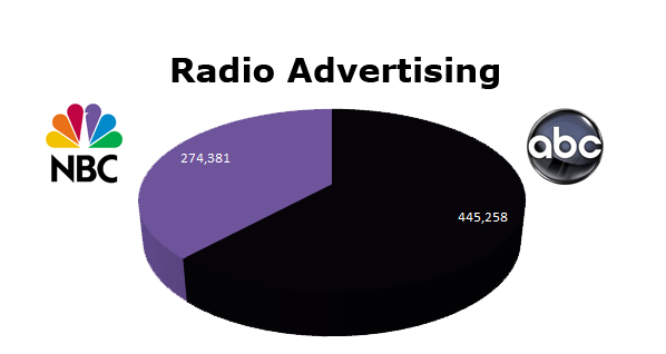 On Radio, NBC ran about 61.6% as many spots as ABC. The totals for the last 12 months were NBC 274,381 to ABC’s 445,258 ads. Following the sweeps, ABC ran the most spots in May (61,806) and in November (48,578). NBC-TV was hot in September (60,986) and March (36,994).