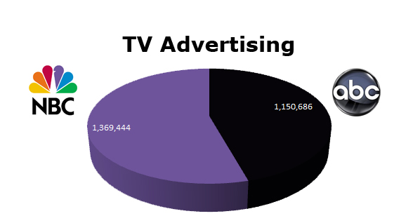 TV on TV again is logical. NBC ran 1,369,444 spot on TV in the last 12 months, while ABC ran 1,150,686 spots. ABC having plus 100,000 spots months in May, November and January. NBC-TV ran over 100,000 in all months by February and ran extremely heavy in the last four months: October (125,236), November (124,682), December (122,927) and January (120,755).