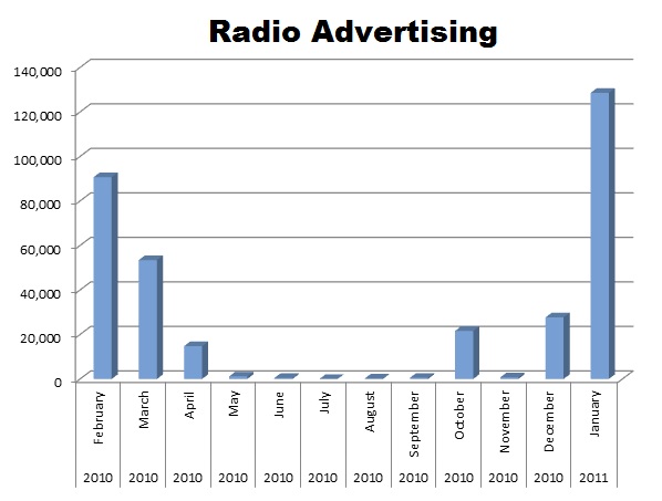 On Radio, Intuit ran 340,032 in the last 12 months with the largest months from January to April 15th Tax Day. January, last month, they ran 128,598 spots, and last February they ran 90,710 spots, with March netting 53,468 spots and April had 14,744 ads.