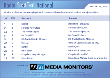 GEICO continues its streak of #1 since last fall with 44,506 spots. SAFELITE AUTOGLASS holds onto #2 with 38,409 ads, while THE HOME DEPOT spring from #11 to #3 with 27,767 spots. MCDONALD’S gets #4 and “lovin’ it” with 24,865 spots and the HD DIGITAL RADIO ALLIANCE scores #5 with 21,654 spots.