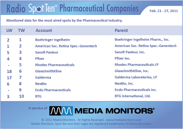 This category should not be confused with spots that focus on specific drugs or products. These spots are presented by the pharmaceutical companies asking people to become part of clinic trials or to make people aware of certain disorders and diseases and available treatments. #1 Pharmaceutical company in the Unites States on the radio was BOEHRINGER INGELHEIM with 553 spots. AMERICAN SOCIETY OF RETINEA SPECIALISTS – GENENTECH was #2 with 477 ads. SANOFI PASTEUR was #3 with 132 spots, while PFIZER was #4 with 102 commercials, while RHODES PHARMACEUTICALS was #5 airing 80 announcements. GLAXOSMITHKLINE was #6 with 77 spots and NEXBIO was #8 with 54 spots. ENDO PHARMACEUTICALS was #9 with 45 spots and BTG was #10 with 44 spots.