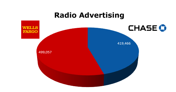 On Radio, Wells Fargo ran 499,057 spots against Chase campaign that delivered 419,466 spots. Interestingly, Chase’s biggest month was last February 2010 with 60,588 spots, while Wells Fargo ran the most in August with 64,885 ads.