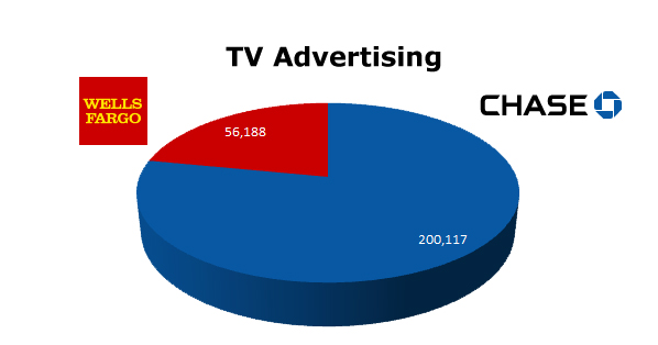 On TV, Wells Fargo only ran a little over 28% of what Chase ran. Chase ran 200,117 spots in the last 12 months, while Wells Fargo ran 56,188 TV spots.