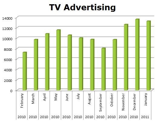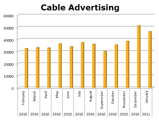 One would expect one of the largest Cable companies to use cable to promote its products. Cox Communication ran 444,118 spots in the last 12 months. Their biggest month was this December with 51,289 spots.