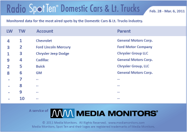 The debate over whether the federal government should have bailed out the US automakers continues but before we get all excited about how much they are advertising, we should notice that we only have 6 for our SPOT TEN. The #1 advertiser out of the American cars and truckers was CHEVROLET with 8,983 spots. Coming in #2 was FORD LINCOLN MERCURY with 5,226 spots, while CHRYSLER JEEP DODGE dropped from #1 to #3 airing 1257 radio commercials. CADILLAC was #4 with 521 spots and BUICK at #5 with 98 spots and GM at #5 with 47 ads. We are still not seeing the full range of US brands using radio to advertise.
