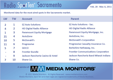 In the capital of California the #1 radio advertiser last week was EZ AUTO SOLUTIONS with 650 spots. The HD DIGITAL RADIO ALLIANCE was #2 with 605 spots, while PARAMOUNT EQUITY MORTGAGE was #3 with 573 spots. AUTOZONE was #4, up from #21, with 518 spots and MCDONALD’S served #5 with 483 commercials. PROGRESSIVE was #6 with 478 spots and GEICO was #7 airing 450 announcements. FRONTIER BUNDLE was #8 with 441 and JACKSON RANCHERIA CASINO & HOTEL was #9 rolling 414 spots. The SHANE COMPANY was #10 with 413 spots.