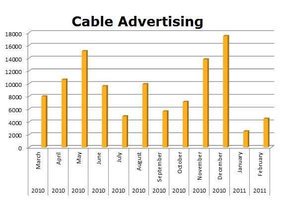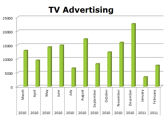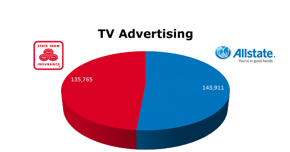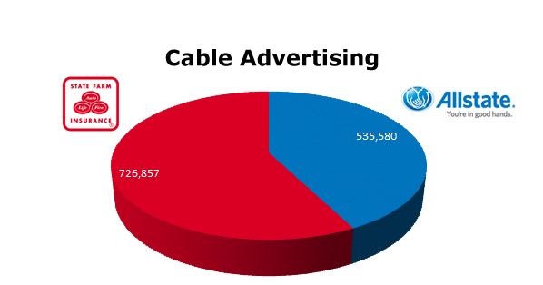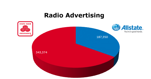On the radio, State Farm ran 343,374 spots in the last 12 months to Allstate’s 187,350 spots. July was Allstate’s hottest month with 32,043 spots and State Farm ran the most radio spots in last March with 67,692 spots and last month, February was very strong with 59,233 ads. It looks like Allstate is a little slow out of the gate with radio in 2011.