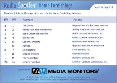 In this category the #1 radio advertiser was THE DUMP with 2,287 spots. Sitting down at #2 was ASHLEY FURNITURE HOMESTORE with 1,852 spots, while BOB’S DISCOUNT FURNITURE landed at #3 with 1,354 ads. BLINDS.COM lowered from #3 to #4 with 1,061 commercials and GALLERY FURNITURE held steady at #5 airing 1,015 spots. HAYNES was #6 with 716 spots, while SLUMBERLAND came in #7 with 309 spots. GRAND FURNITURE made their entrance at #8 with 300 spots and THE ROOMPLACE was #9 with 292 spots. LENNY’S FURNITURE WAREHOUSE took #10 with 280 spots.
