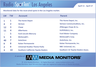 In LA last week, VERIZON was #1 on the radio with 1,271 spots. CHASE jumped from #12 to #3 with 1,193 ads, while ALBERTSONS was in at #4 airing 821 commercials. FORD LINCOLN MERCURY was #5 with 795 spots and MCDONALD’S was #6 with 716 announcements. AUTOZONE drove from #40 to #7 with 684 spots, while KAISER PERMANENTE was #8 running 669 spots. UNIVERSAL STUDIO THEME PARK was #9 with 602 spots and SOUTHERN CALIFORNIA TOYOTA DEALERS was #10 airing 595 spots.