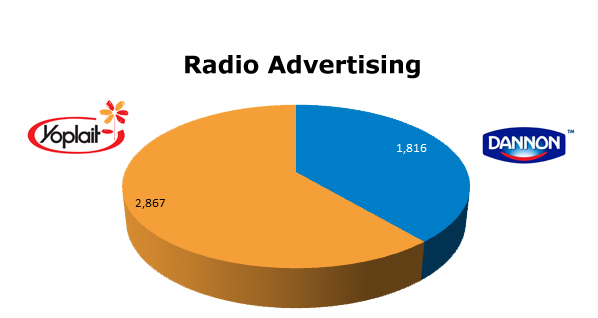 On Radio both players barely lifted the lid on this media. Yoplait ran only 2,867 spots in the last 12 month, while Dannon was even thinner with 1,816 spots.
