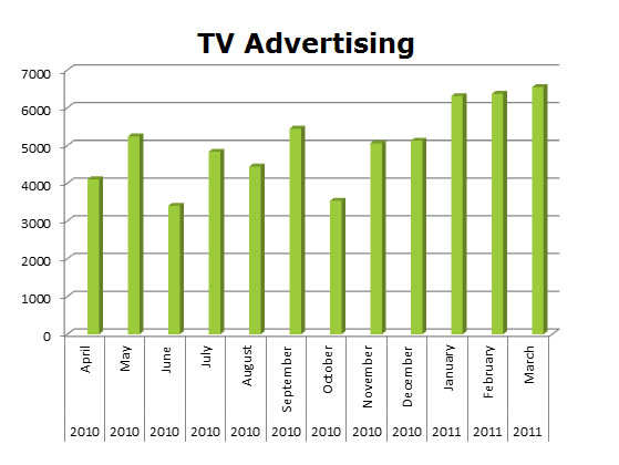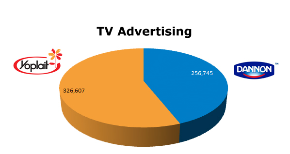 On TV, Yoplait led with 326,607 spots to Dannon’s 256,745 ads. Looks like Yoplait spend biggest in January with 38,028, while Dannon’s biggest month was July with 37,827 spots.