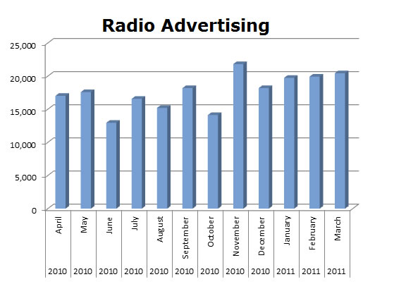 73% of all the spots MetroPCS ran on all three media were run on radio. The total in the last 12 months was 211,806 spots. The biggest month was November with 21,820 ads.