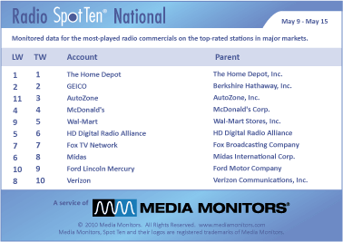 On the national radio front, THE HOME DEPOT maintained its vice-liked grip on #1 running 55,751 spots. GEICO held at #2 with 43,814, while AUTOZONE jumped back up to #3 with 34,202 ads. MCDONALD’S held at #4 with 27,129 spots and WAL-MART moved from #9 to #5 with 22,287 spots.
