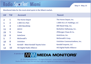 In Miami last week, THE HOME DEPOT was the #1 radio advertiser with 1,075 spots. 1-800-411-PAIN was #2 with 1,011 ads, while 1-800-NEEDHELP was #2 airing 833 spots. GEICO drove into #4 from #11 with 820 spots and CHASE Bank was #5 with 673 commercials. AUTOZONE was #6 with 672 spots and MCDONALD’S was #7 running 529 ads. UNIVISION was #8 with 450 spots, while KENDALL – WEST KENDALL TOYOTA SCION took #9 with 412 spots. Coming in #10 was the HD DIGITAL RADIO ALLIANCE with 389 announcements.