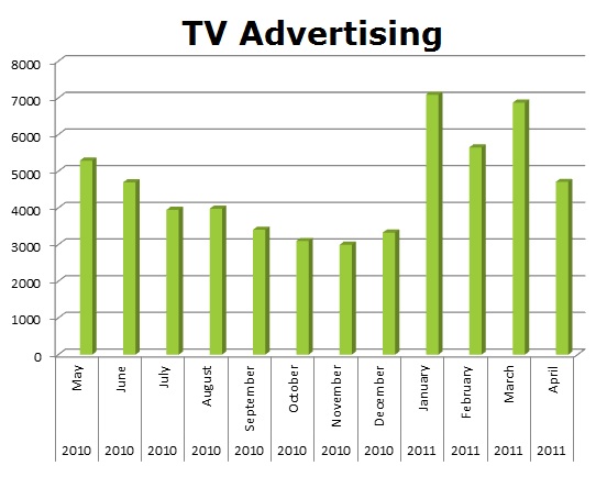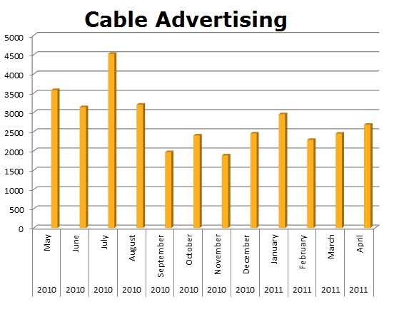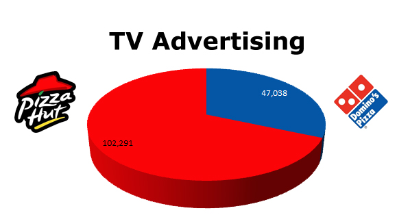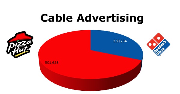 In Cable, Pizza Hut blew the roof off Domino's. Pizza Hut ran 501,628 spots against Domino's 230,234 spots. March was Domino's biggest month with 28,001 spots, while Pizza Hut’s biggest month was last month (April) with 57,913 spots.